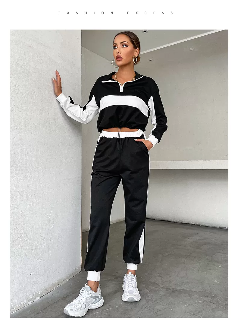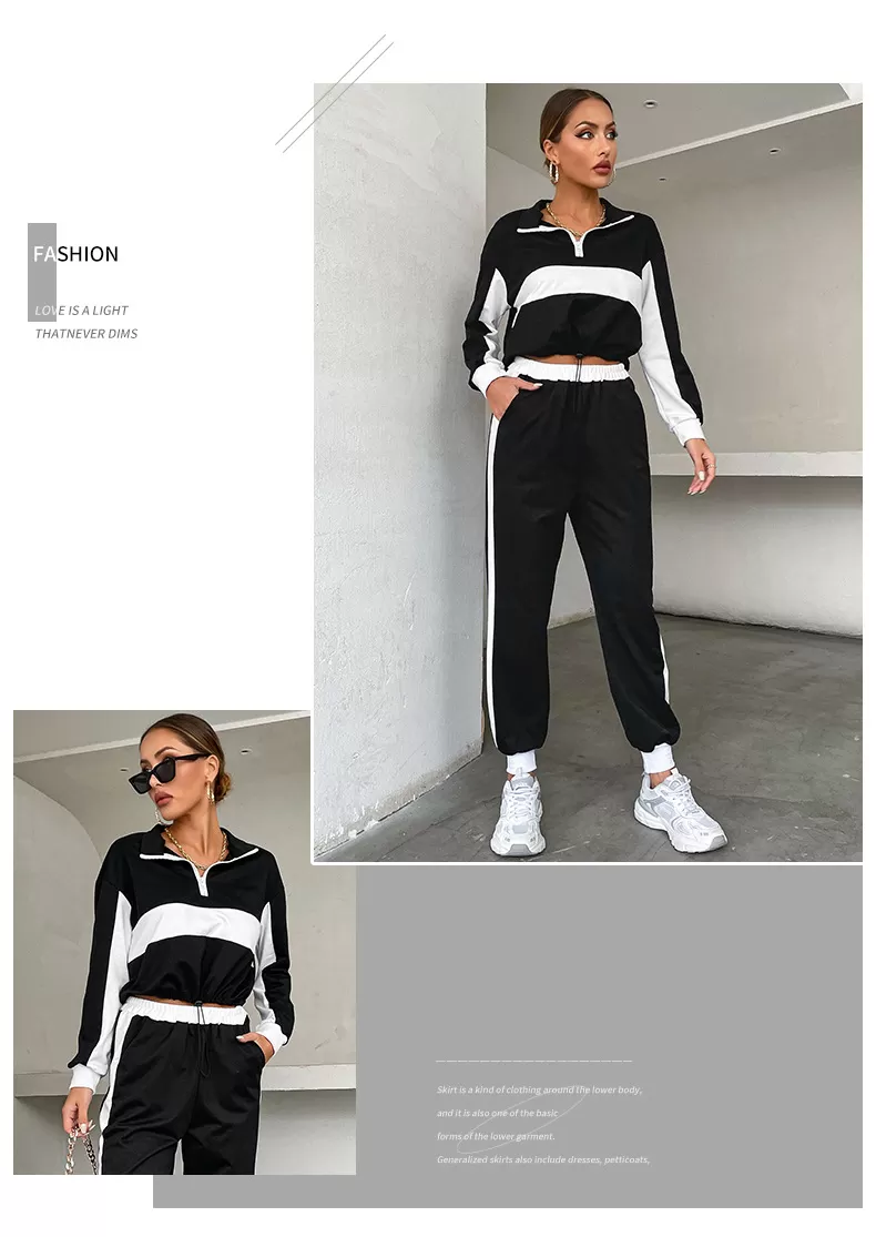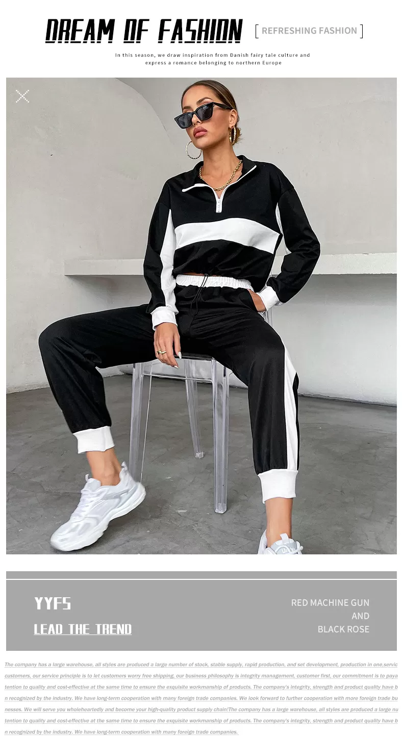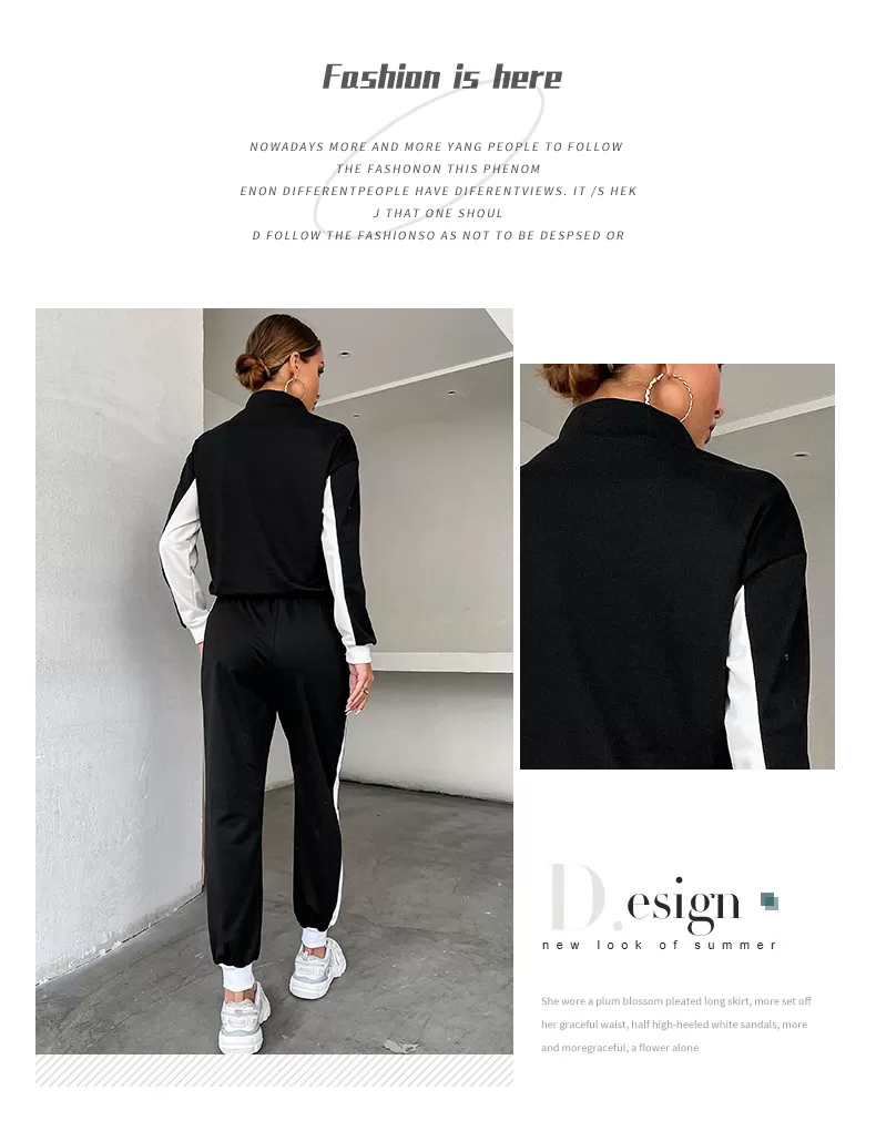 Patchwork Stand-up Collar Sweater Casual Suit Two-piece Set Patchwork Stand-up Collar Sweater Casual Suit Two-piece Set
