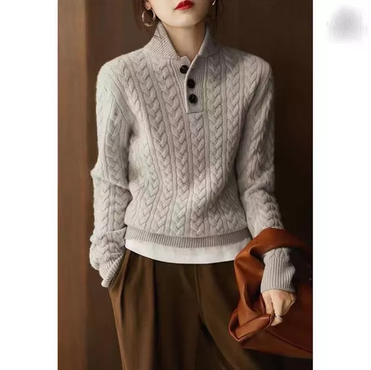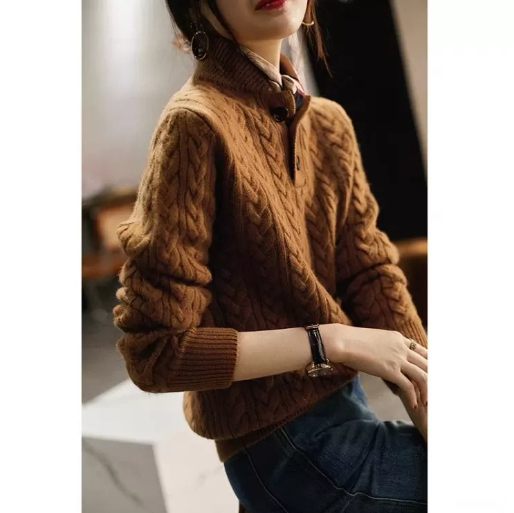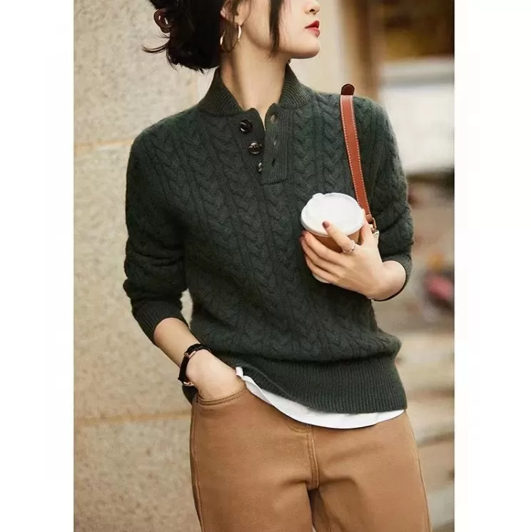 Baseball Collar Twisted String Textured Knitted Sweater For Women Baseball Collar Twisted String Textured Knitted Sweater For Women