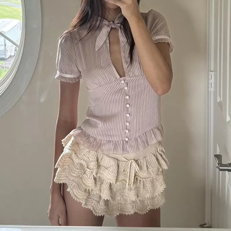 Chest-flattering Button Flounce Short Sleeve Chest-flattering Button Flounce Short Sleeve