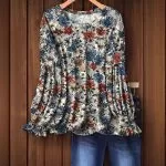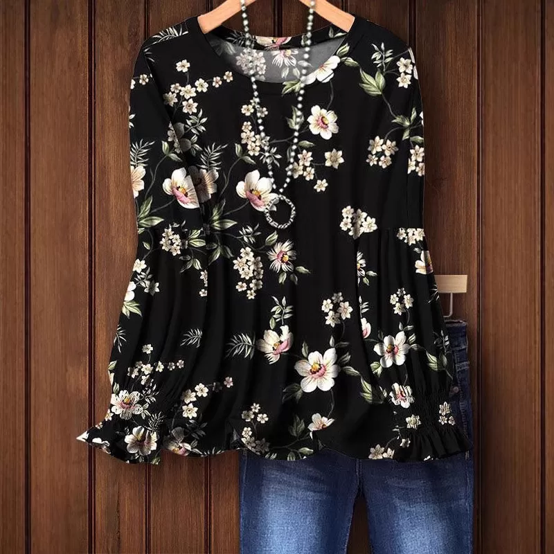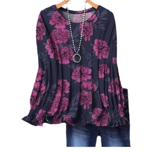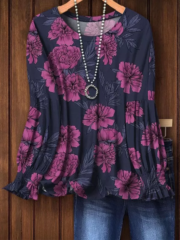 European And American Autumn New Round Neck Floral 3D Printed Long-sleeved Top Women