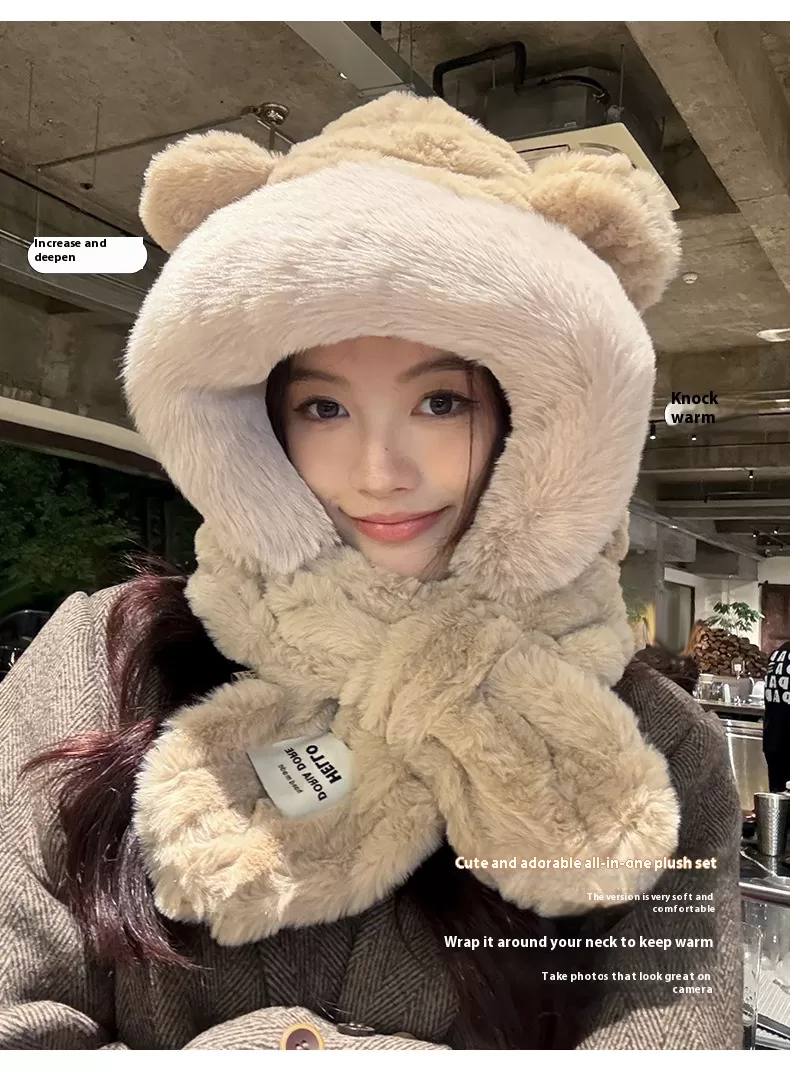 Hat Scarf One Female Student Cute Warm Winter Plush Pullover Ear Protection