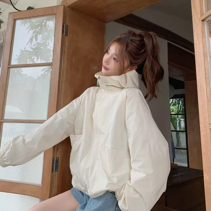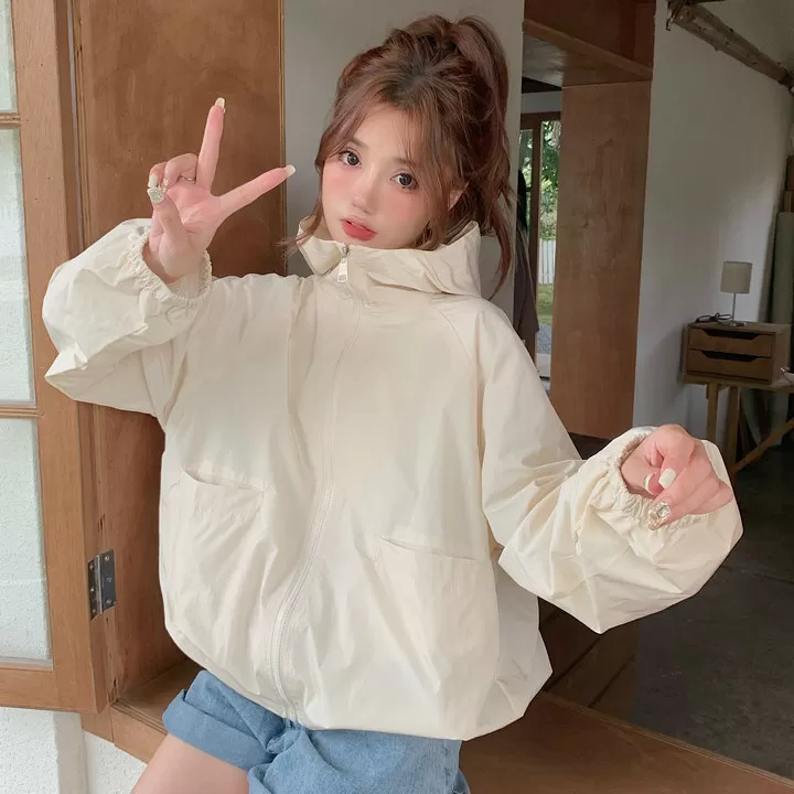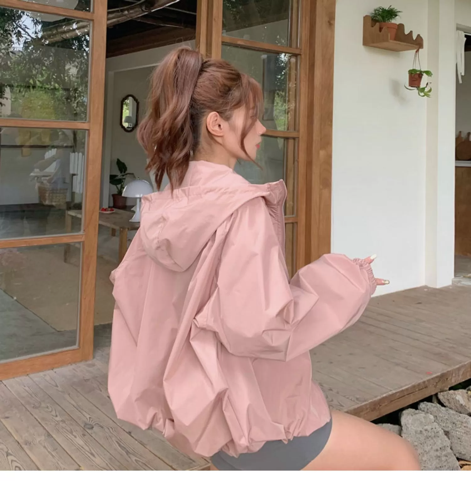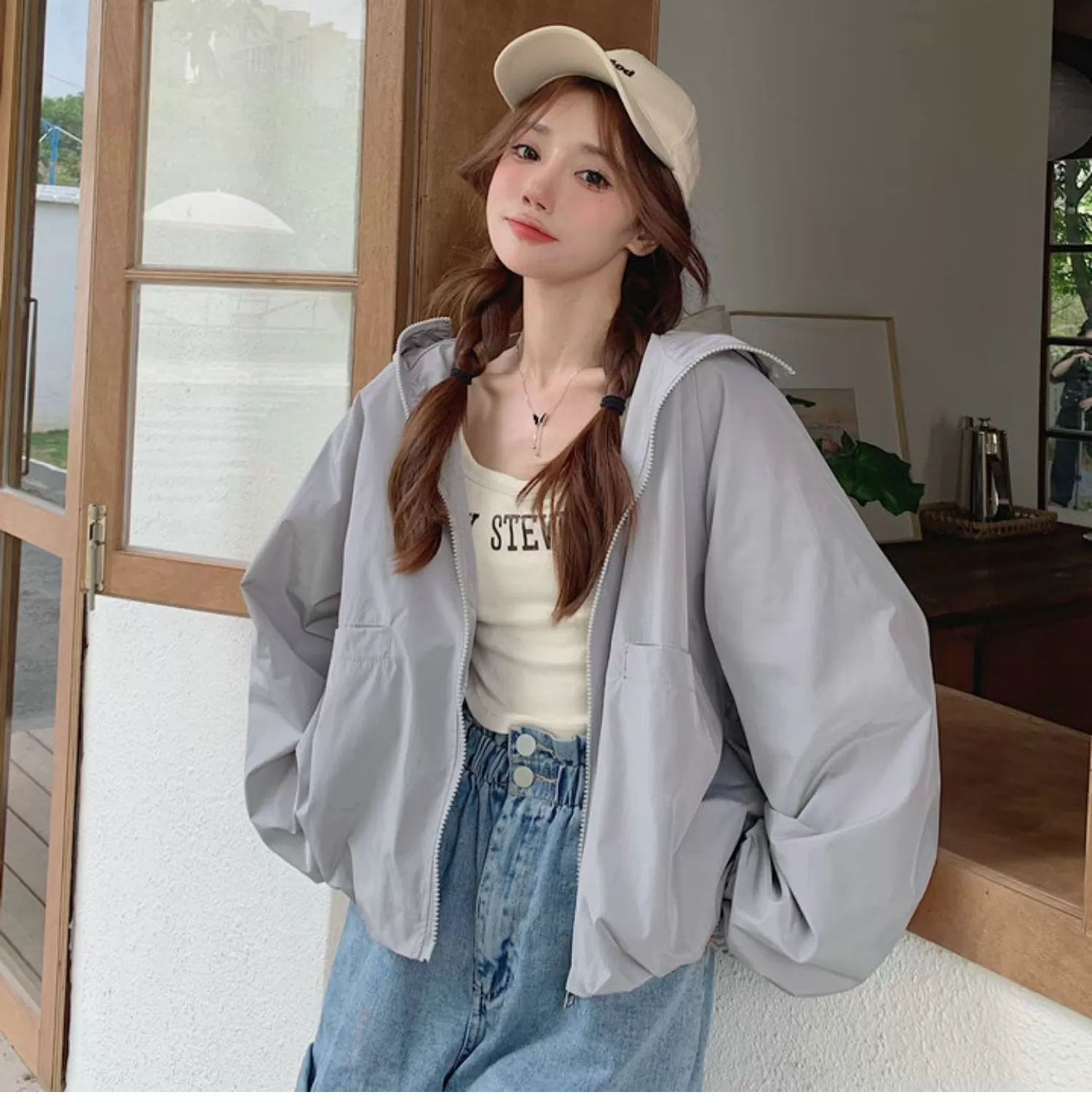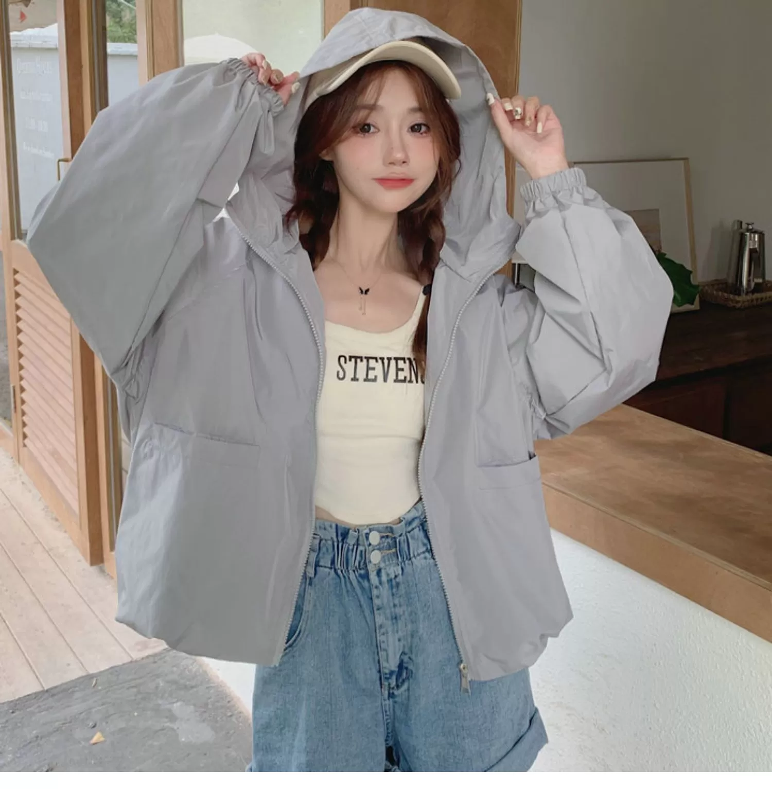 Hooded Short Sports Jacket Women’s Casual Loose Solid Color Zipper Shell Jacket