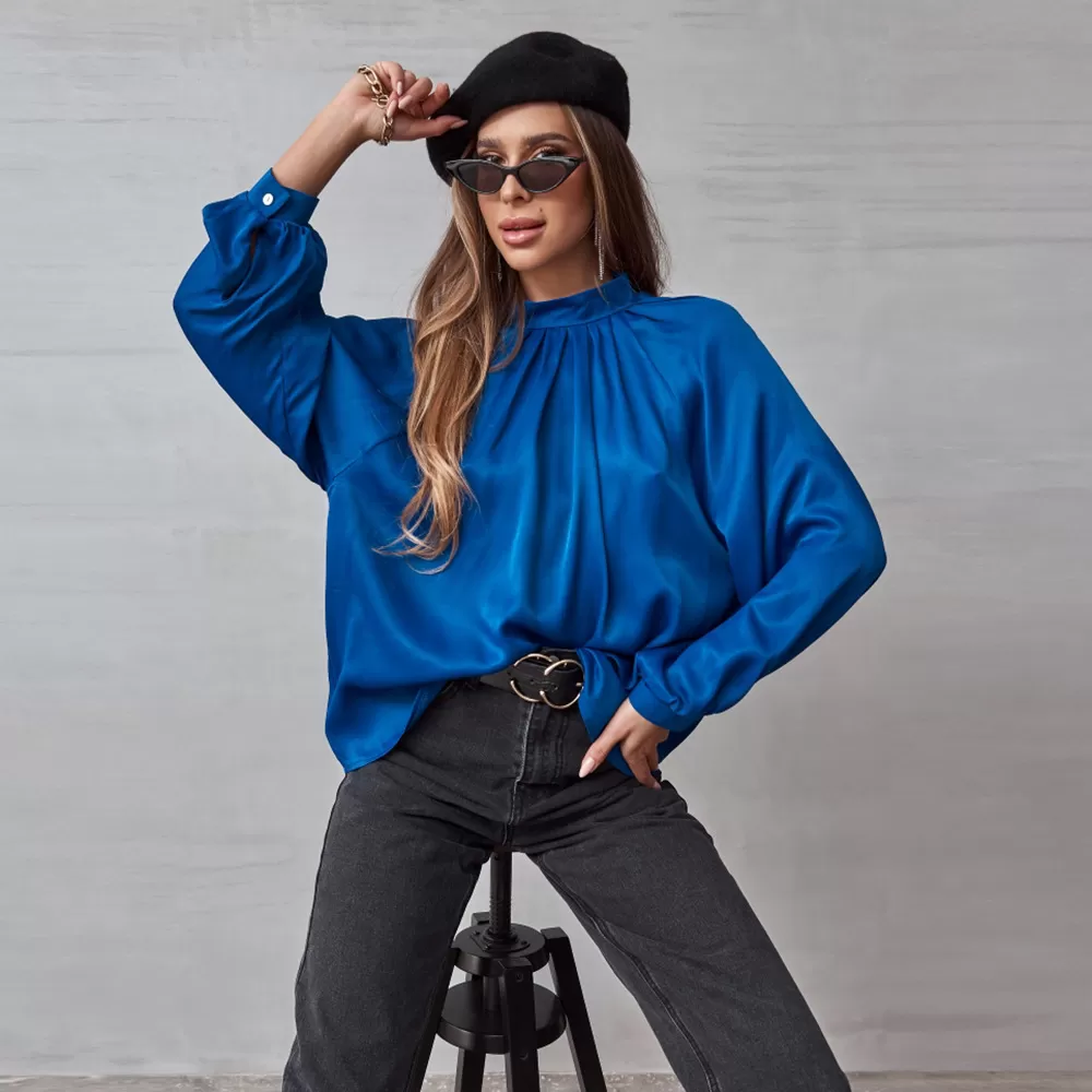 Irregular Stand Collar Stitching Lantern Sleeve Shirt Top Irregular Stand Collar Stitching Lantern Sleeve Shirt Top