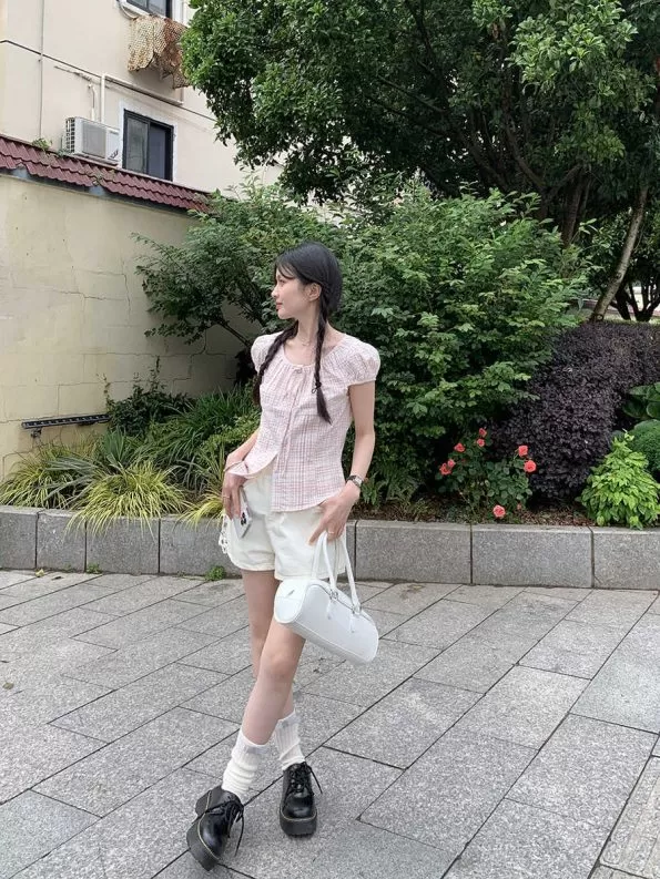 Lace-up Bow Puff Sleeve Retro Plaid Shirt Lace-up Bow Puff Sleeve Retro Plaid Shirt