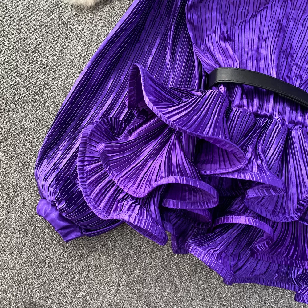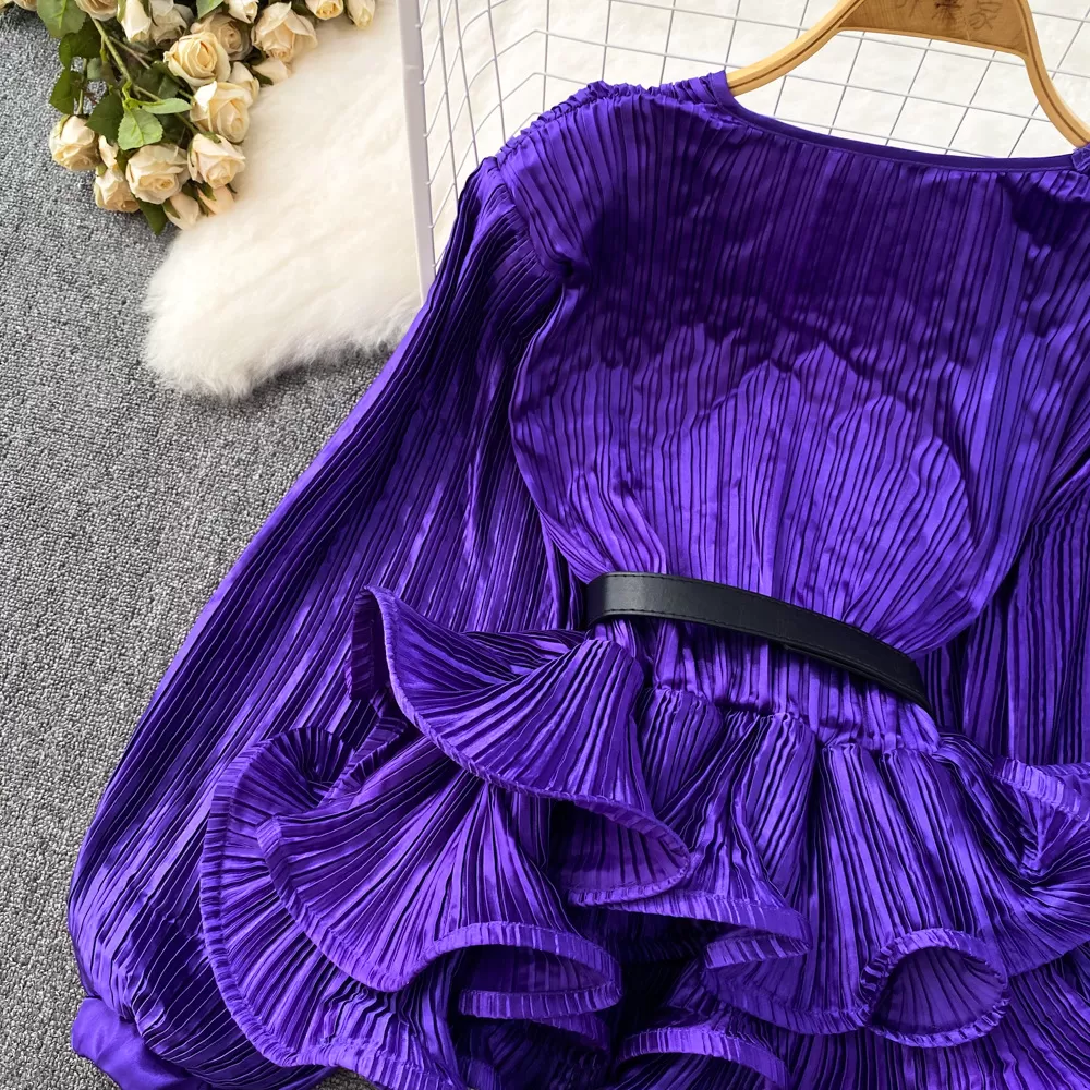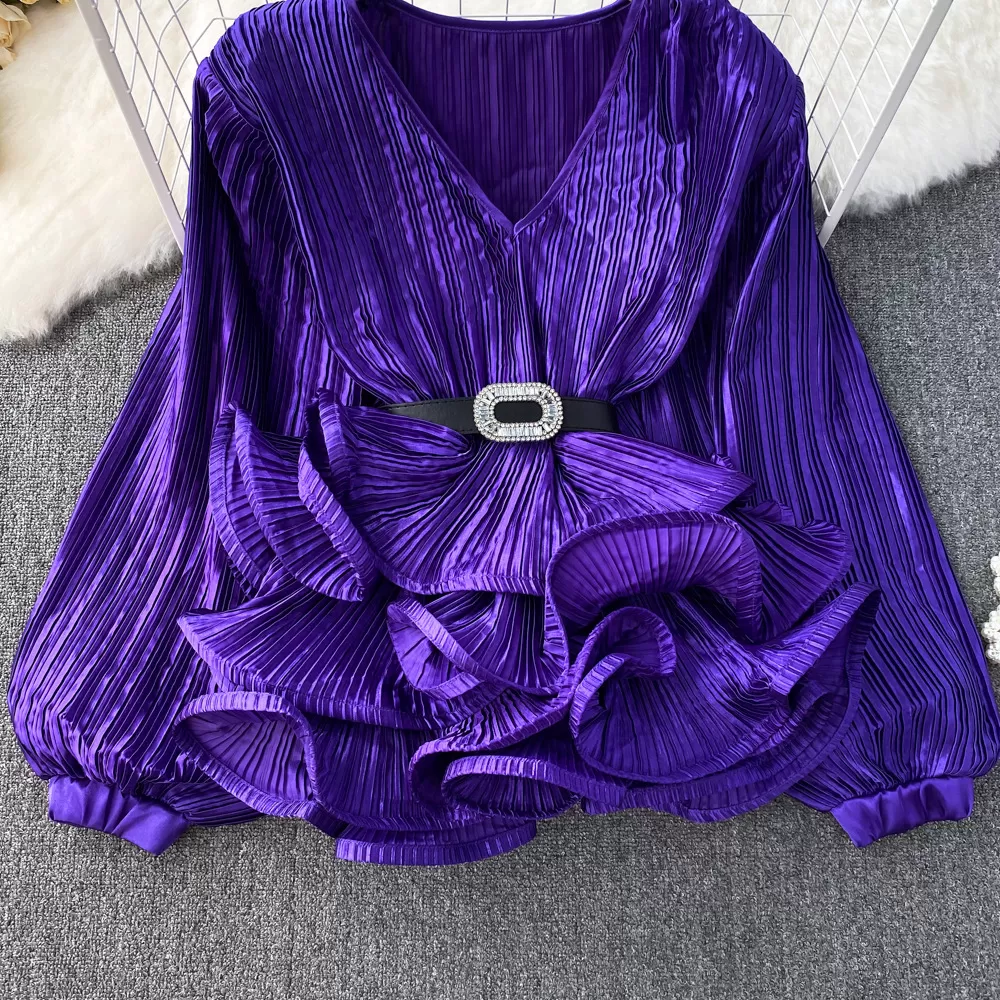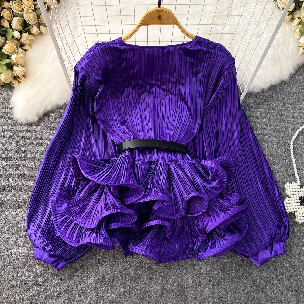 Lantern Long Sleeve V-neck Loose Belly-covering Waist Ruffle Hem Pullover Shirt