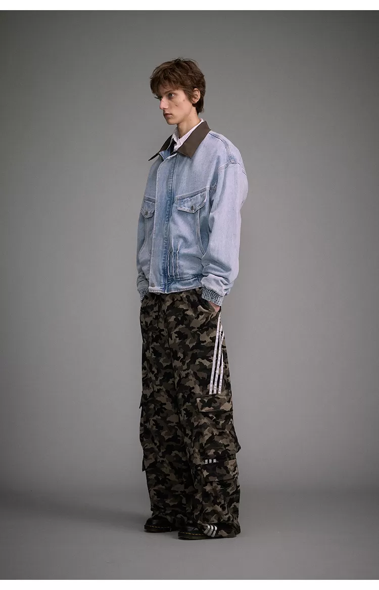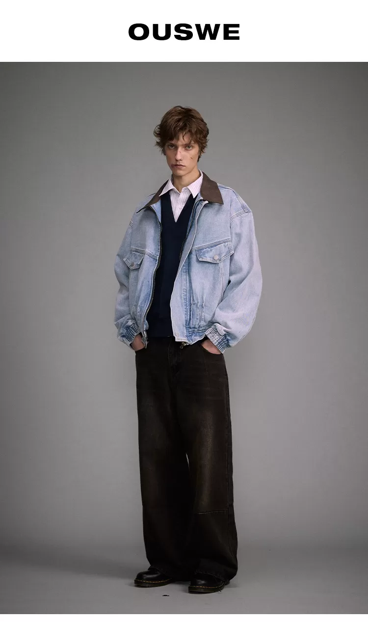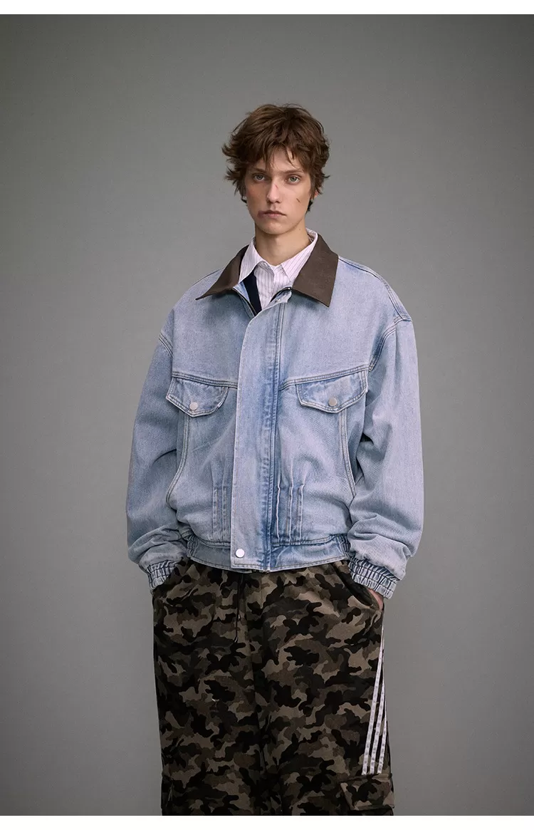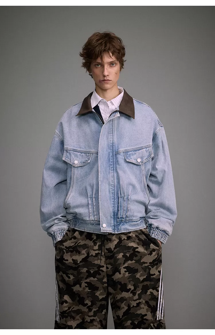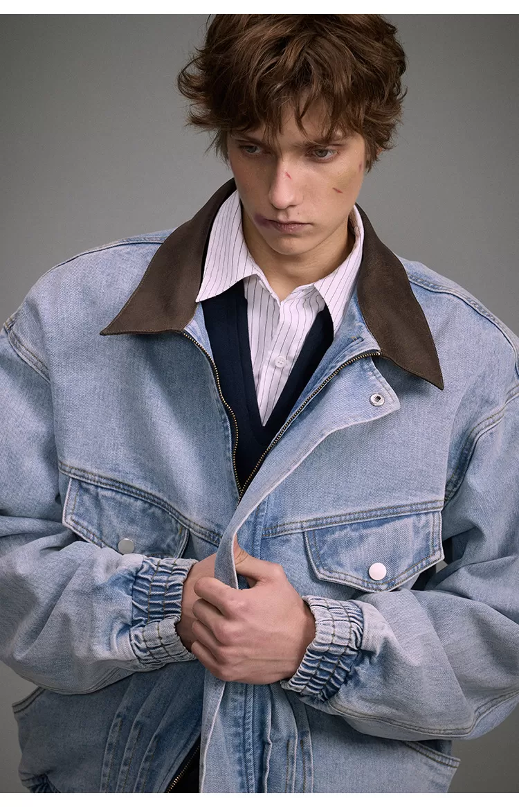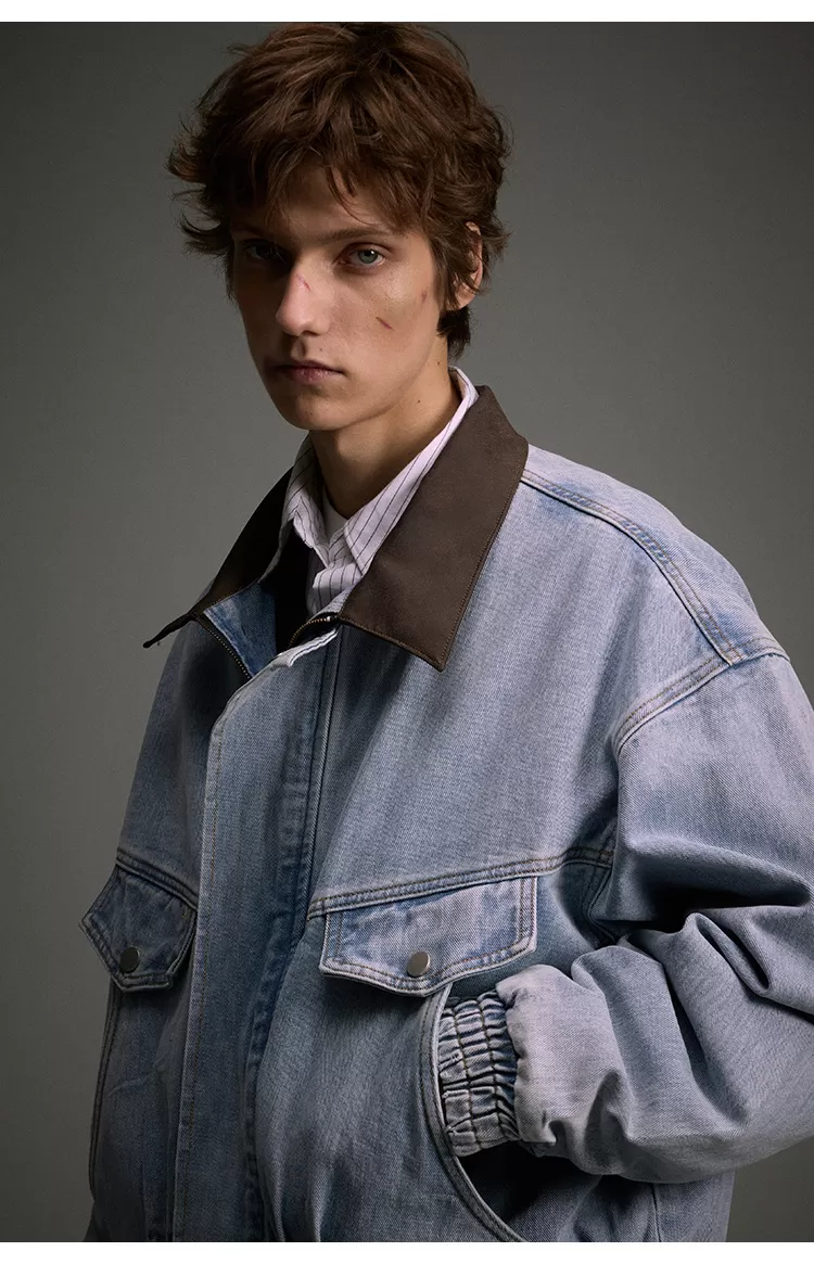 Loose Washed-out Lapel Workwear Denim Men’s And Women’s Motorcycle Jacket