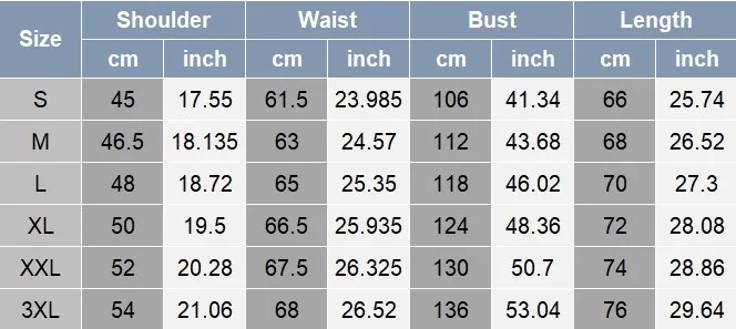 Note: 1. Asian sizes are 1 to 2 sizes smaller than European and American people. Choose the larger size if your size between two sizes. Please allow 2-3cm differences due to manual measurement. 2. Please check the size chart carefully before you buy the item, if you don’t know how to choose size, please contact our customer service. 3.As you know, the different computers display colors differently, the color of the actual item may vary slightly from the following images.