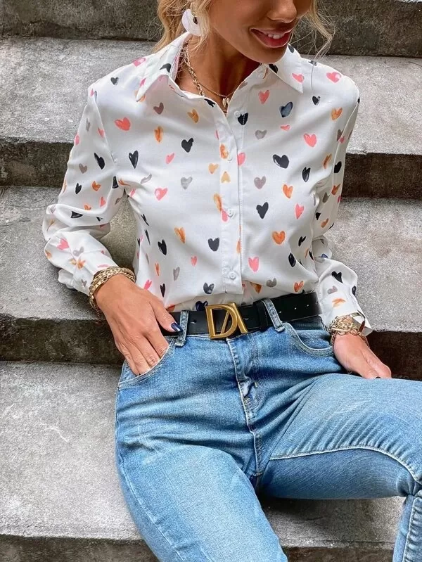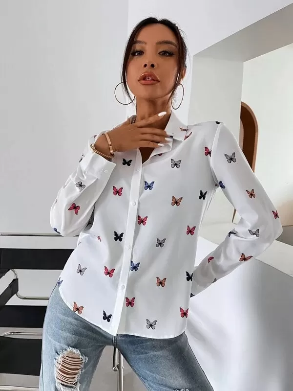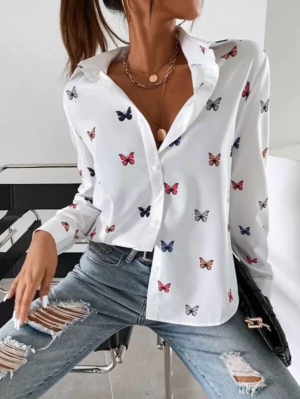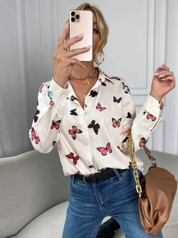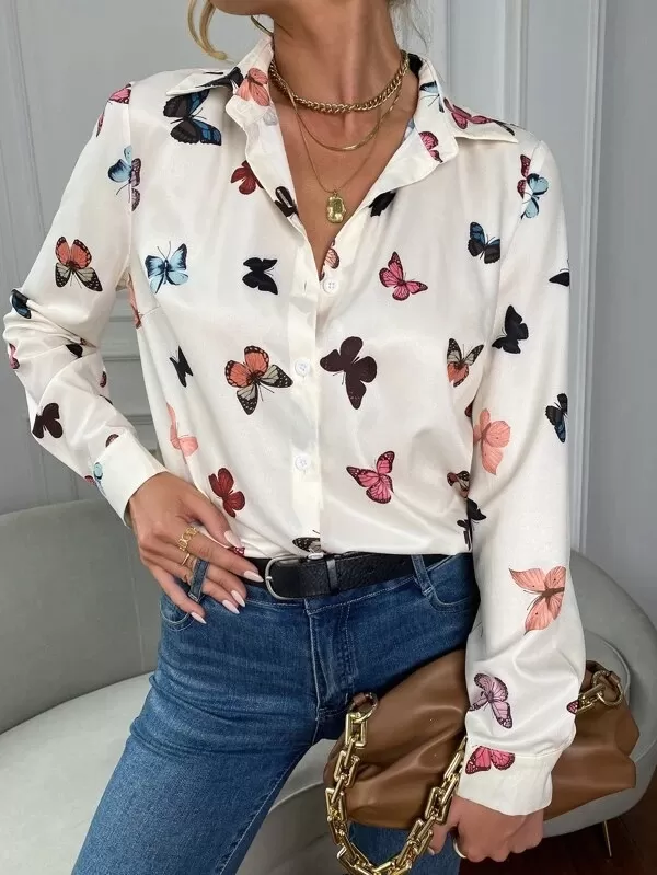 Printed Long Sleeve Butterfly Printing Lapel Shirt