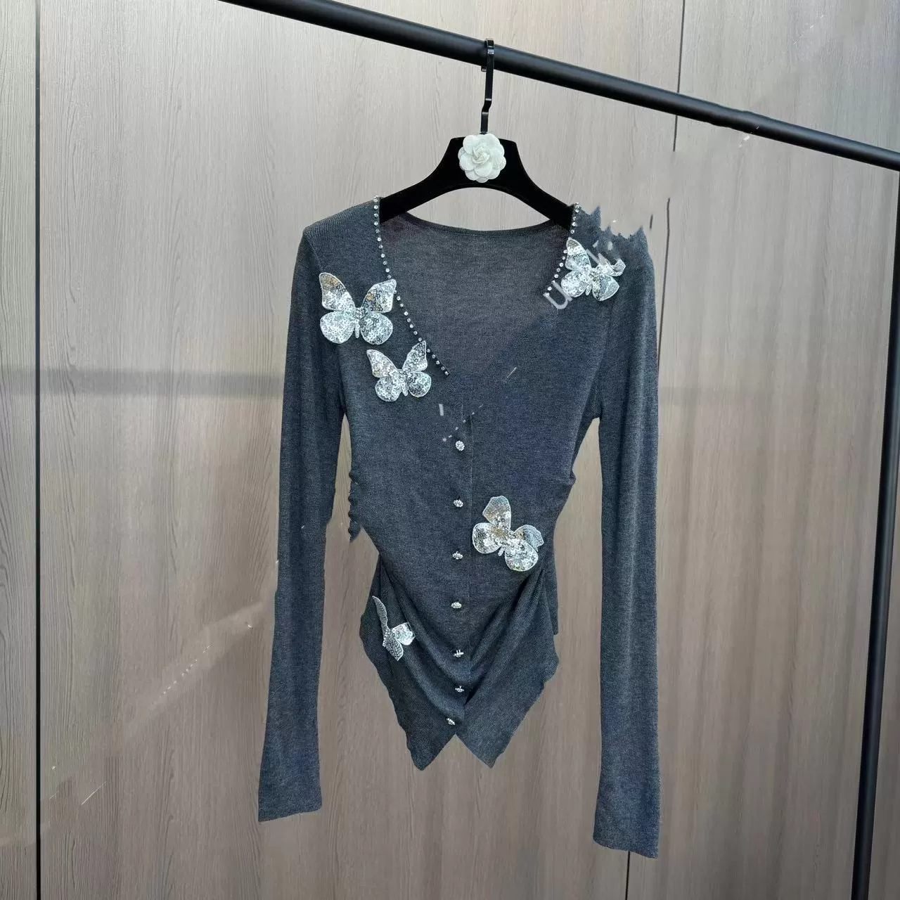 Single Row Diamond Buckle Pinch Pleated Waist-tight Wool Cardigan