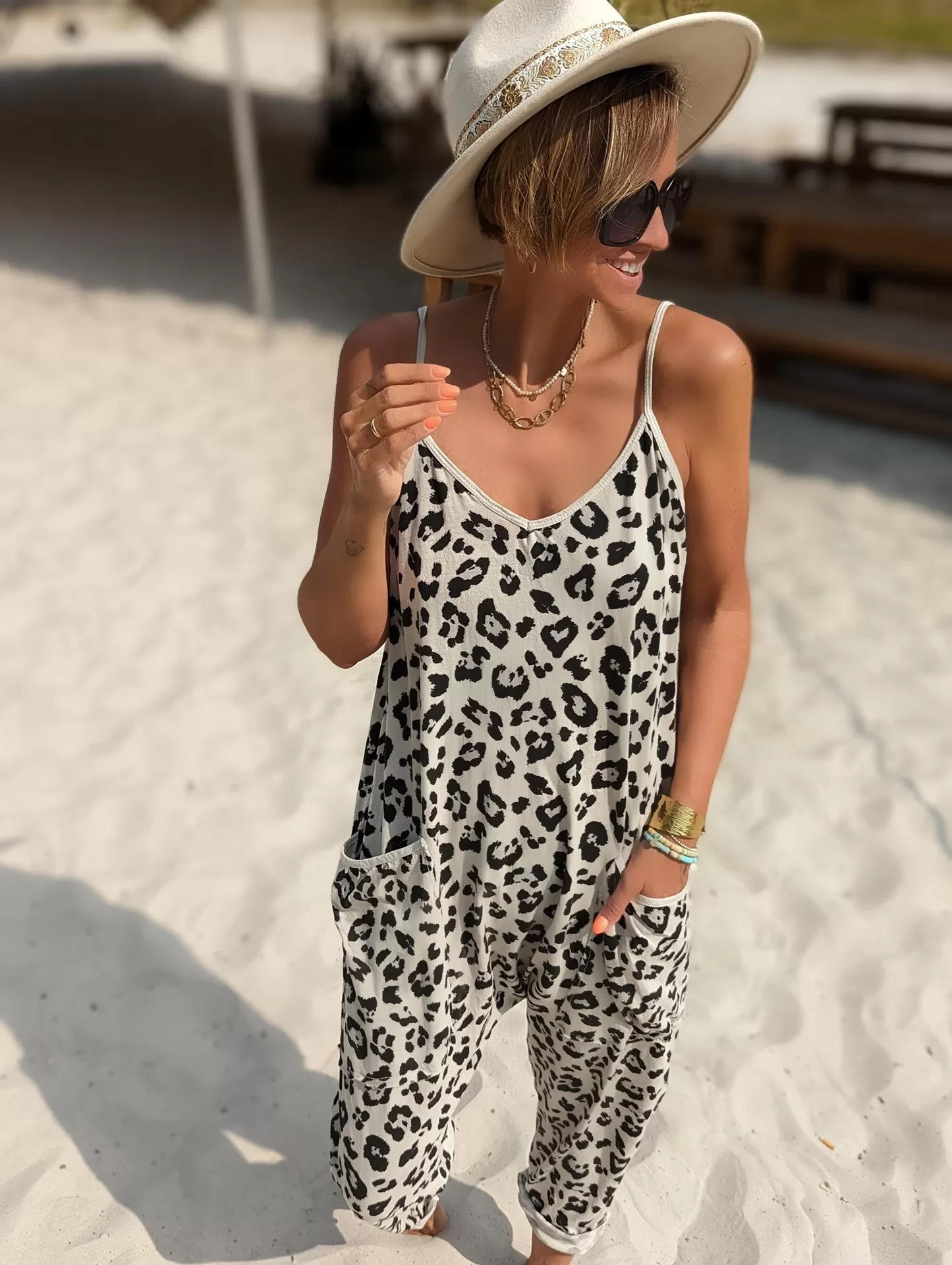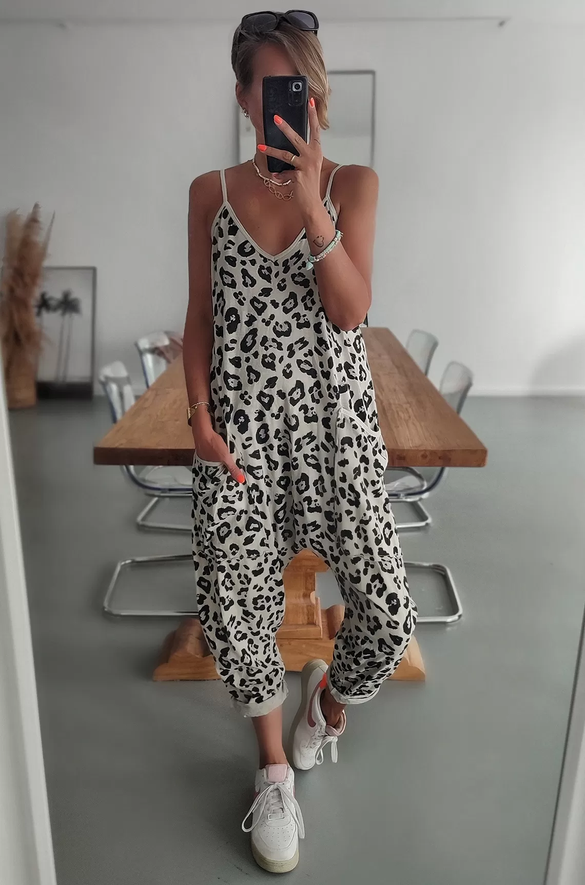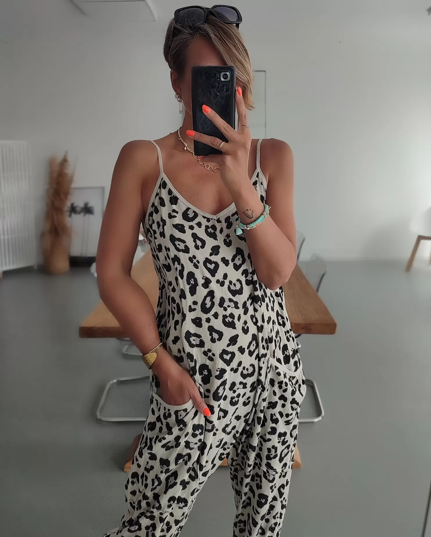 Summer European And American Leopard Print Loose Casual Sling Jumpsuit