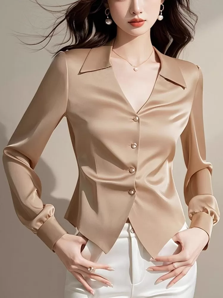 V-neck Long Sleeve Waist Trimming Shirt Women