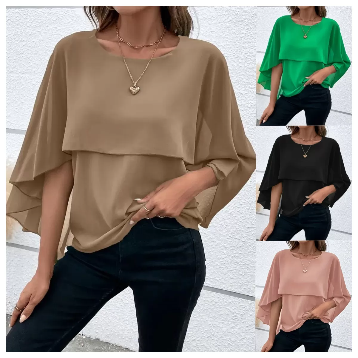 Women's All-match Round Neck Solid Color Layered Cape Sleeve Chiffon Shirt Women's All-match Round Neck Solid Color Layered Cape Sleeve Chiffon Shirt