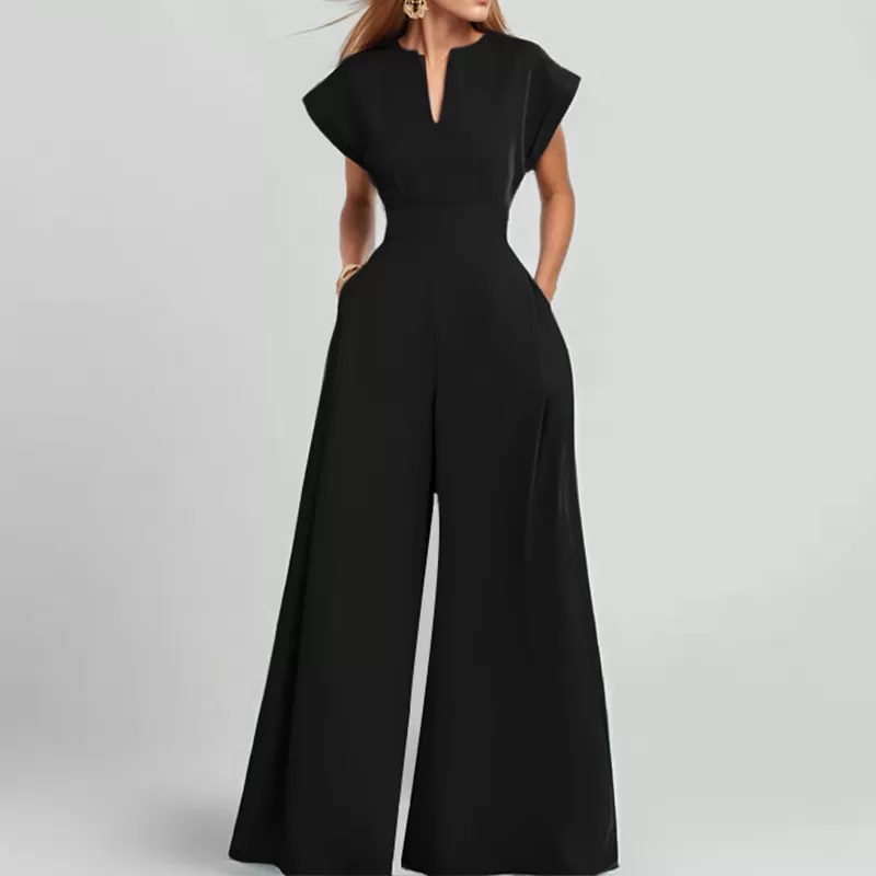 Women’s Elegant Solid Color And V-neck Sleeveless Waist Wide-leg Jumpsuit
