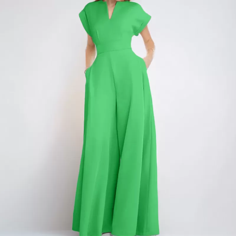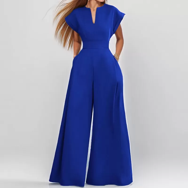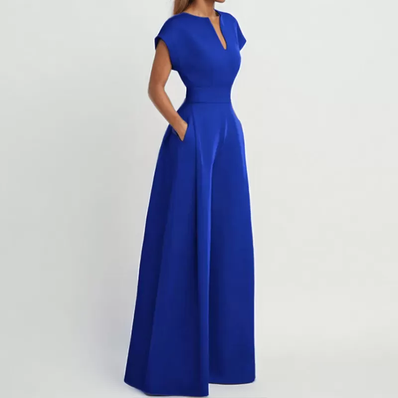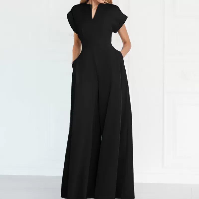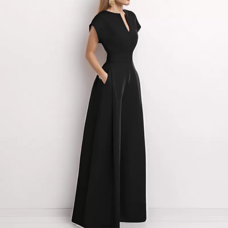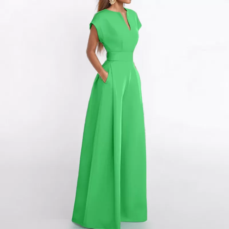 Women’s Elegant Solid Color And V-neck Sleeveless Waist Wide-leg Jumpsuit